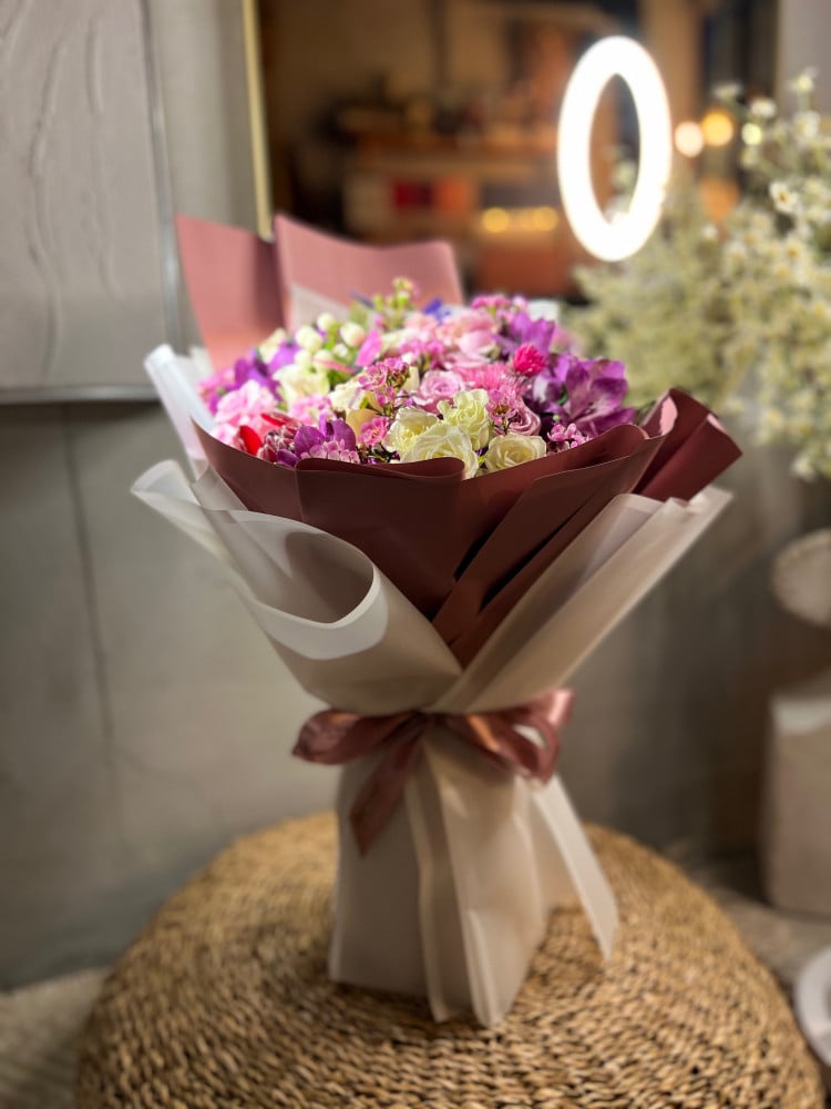 ملاحظة: قد تختلف بعض اصناف الورد بحسب الموسم وتوفرها مع المحافظه على الشكل العام للباقة.