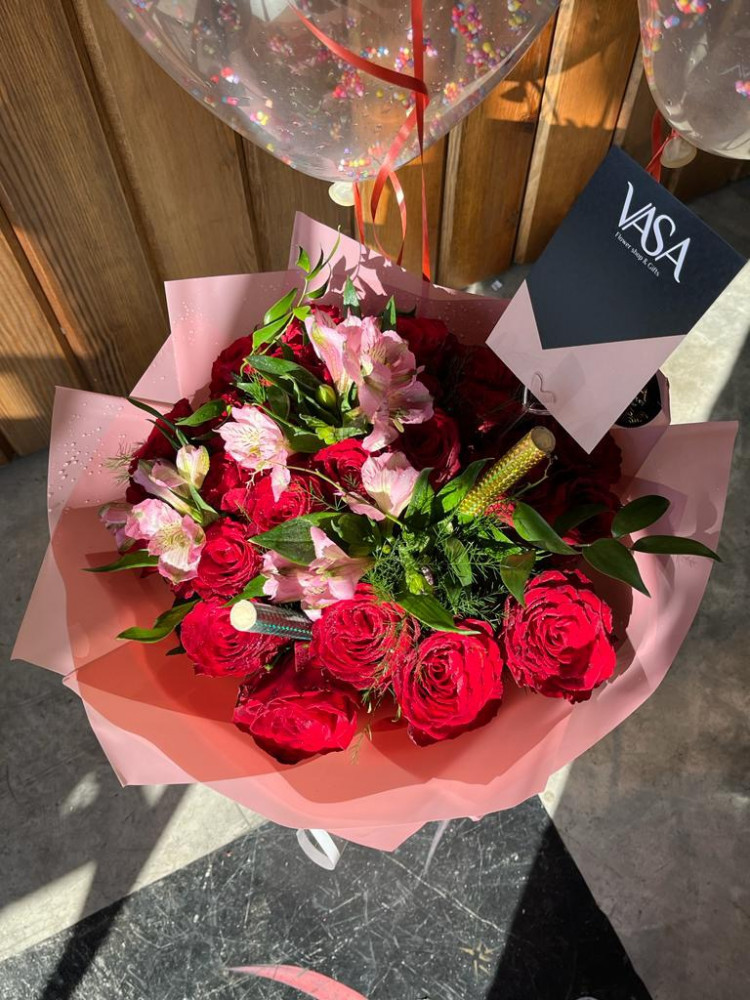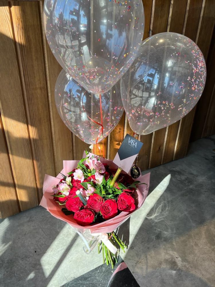 بوكيه ورد كبير مع بالون هيليوم وشمعه شرار