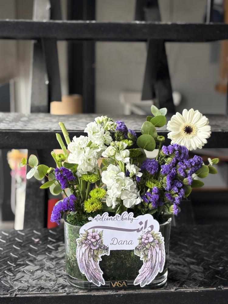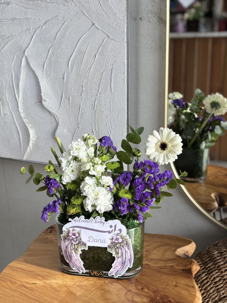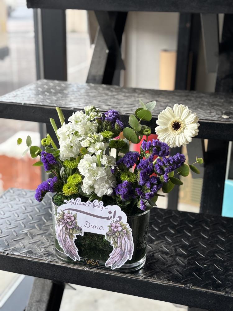 فازة زجاجية مع تنسيق الاسم والورد