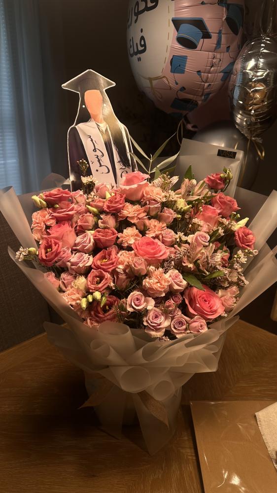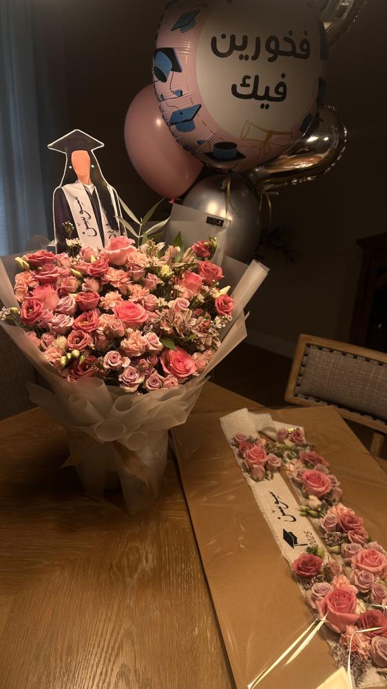 بكج يحتوي على باقه ورد كبيره مع تاق التخرج بالاسم